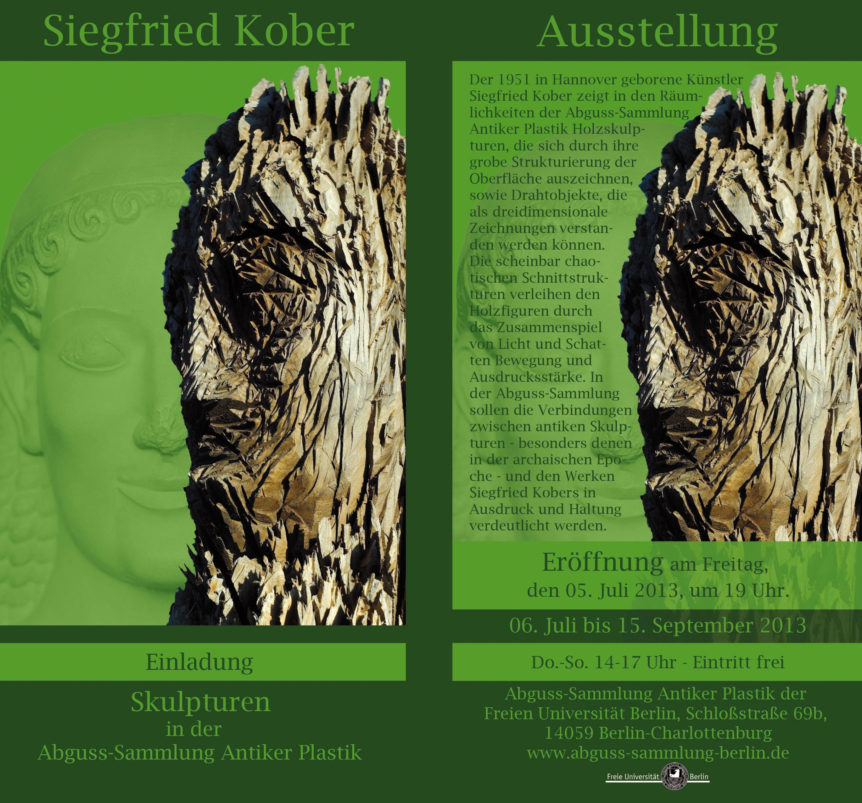 Der 1951 in Hannover geborene Künstler Siegfried Kober zeigt in den Räumlichkeiten der Abguss-Sammlung Antiker Plastik Holzskulpturen, die sich durch ihre grobe Strukturierung der Oberfläche auszeichnen, sowie Drahtobjekte, die als dreidimensionale Zeichnungen verstanden werden können.
